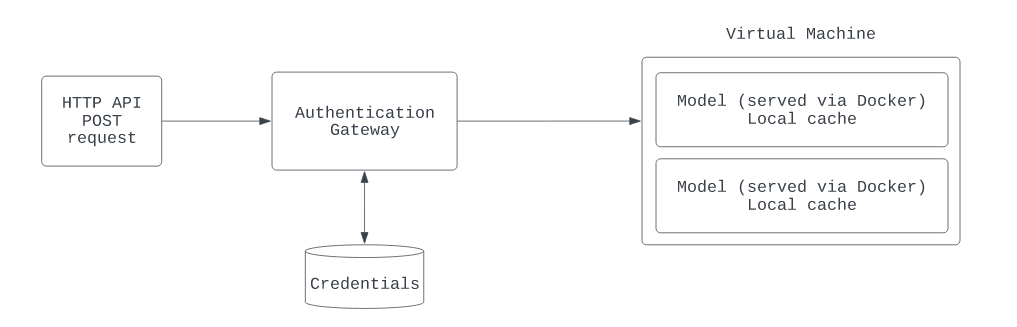 When we started out, we designed our backend architecture with the goal of bringing a functional product live as soon as possible, following a largely monolithic setup. Requests hit a frontend gateway that handled authentication and were routed to a single backend virtual machine that had our models loaded into the GPU and served requests.